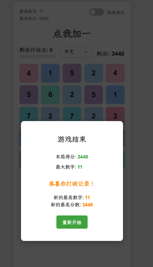 2025 年 4 月 28 日 回复了 BetterFly 创建的主题 › 分享创造 › 做了一个《点我加 1》的网页版小游戏,欢迎体验 |