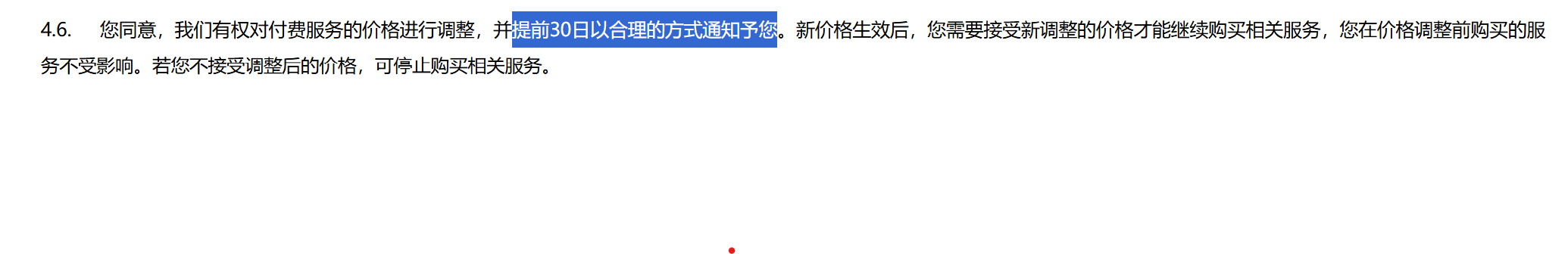 [《阿里云产品服务协议》]( https://terms.aliyun.com/legal-agreement/terms/suit_bu1_ali_cloud/suit_bu1_ali_cloud201802281451_77479.html)  4.6. 您同意,我们有权对付费服务的价格进行调整,并**提前 30 日以合理的方式通知予您**。新价格生效后,您需要接受新调整的价格才能继续购买相关服务,您在价格调整前购买的服务不受影响。若您不接受调整后的价格,可停止购买相关服务。 对于官方自己违反服务协议规定调价不提前通知的行为可以自助申请补偿。 |