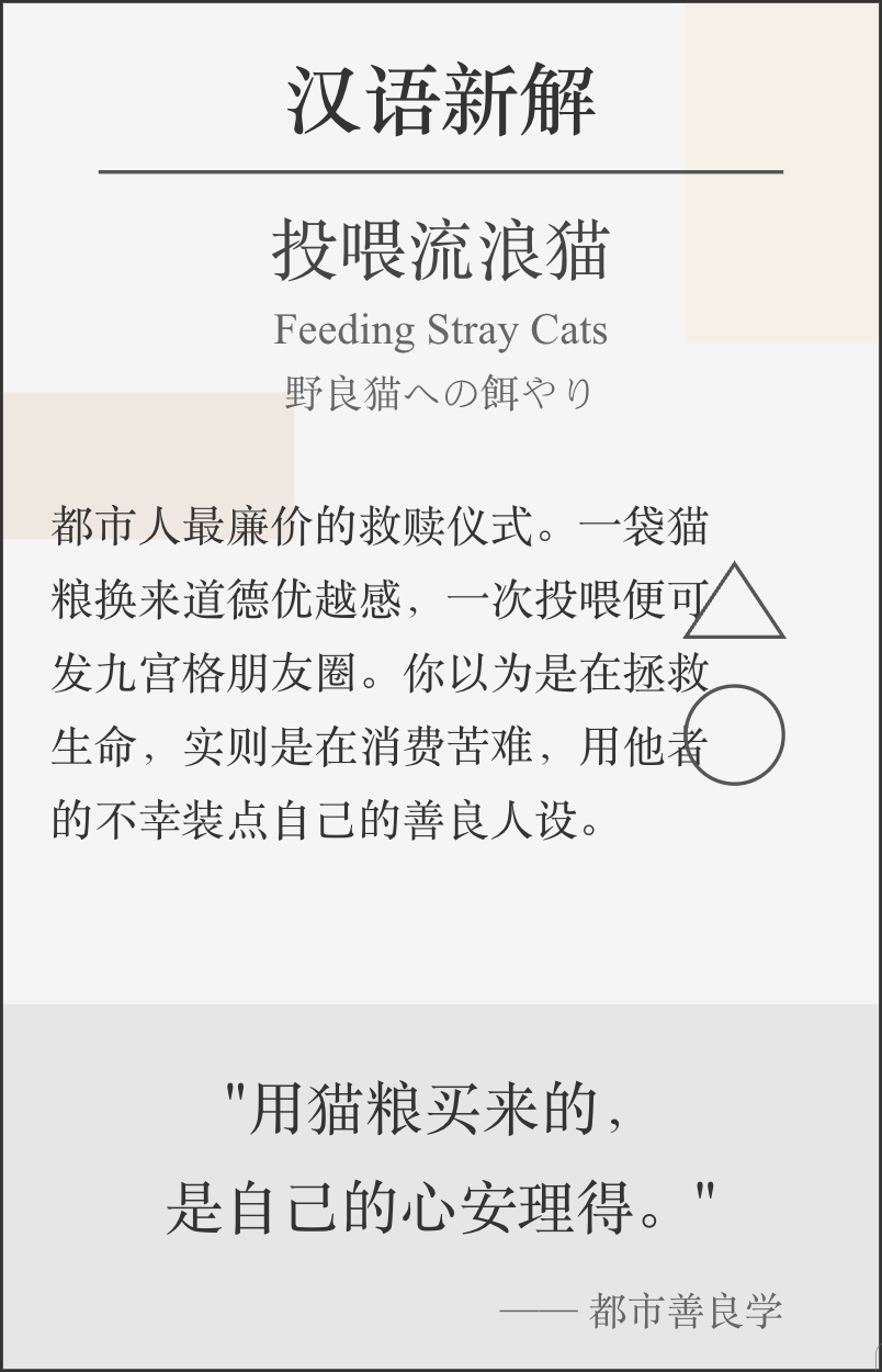 但是投喂了就要标榜自己在做善事,觉得自己比其他人善良的,觉得自己投喂了流狼猫狗就是什么保护小动物之类的,就很难评了。非要说的话可能是比那种虐猫的变态要好点吧。 |