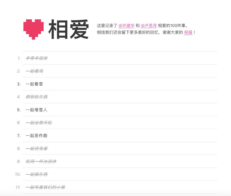 有一次意外的在 V2EX 上看到一个帖子,是一个程序员撒狗粮网站-相爱 100 件事( https://xiang.ai ),看到那个网站的瞬间,我就想到了你,想搭建一个给你。 img![https://mmbiz.qpic.cn/mmbiz_png/Tq0hjgUDf35ZW1ScPVM72JiaGMS9eWoTcbuQdy3t0zU7sF4aE7sTlnjNxO8egjPbqNX6VWXr0g5dgv3X9M5BIcA/640?wx_fmt=png&tp=webp&wxfrom=5&wx_lazy=1&wx_co=1] 虽然那时候我们还没有在一起,但是我自己很有信心,我们之后肯定会在一起的!所以我马上就先去买了一个域名。 域名是你的名字,域名的后缀是 love。所以呀,广大单身男同胞程序员们,如果你的女朋友叫小白,你就可以买一个域名,xiaobai.love ! 我当时还很害怕一件事情,要是我自信过头了....我购买的这个域名就打水飘了哈哈哈哈,花了几百块大洋买的呀,为此都要吃土了。 然后开始研究了一下大佬的网站,他开源了这个主题模板。这个网站实际上是 Typecho 博客,所以我就开始摸索了。网上找到了安装程序,搭建在自己服务器上,然后导入这个主题模板,修改模板。 我自己很不要脸的先写了 50 件事情,希望我们在一起后,由你来书写另外 50 件事情。 建这个网站之后,我还做了一件事情。就是向百度和谷歌搜索提交这个网站链接,希望他们可以收录我的网站。 这样子,我就可以到时候让你在百度,搜索你的名字和我的名字,跳出来的页面里面就有我们的网站!是不是很酷啊。 做完这个网站,我就只给我的好兄弟看了,他看完也觉得很不错,在女朋友生日的时候让我也帮她做一个,也买了一个专属名字的域名给她女朋友。 所以,在沙滩告白的那天,我其实准备了两个礼物。一个是八音盒,另外一个就是这个网站。 我让你在百度搜索我们两个人的名字,然后就出现了我做的那个网站了。你很开心,是第一个男生为你做这种事情(因为我是你的初恋呀哈哈哈)。 后来,你也完成了另外 50 件事情的书写,我将它输入到了我们的网站,现在完成的越来越多了,但还有很多有难度有意义的事情等待我们一起完成! |