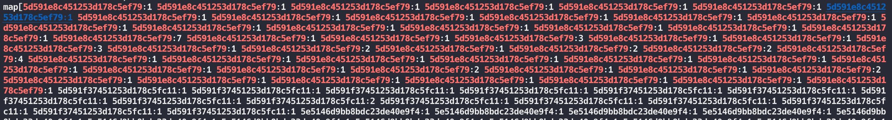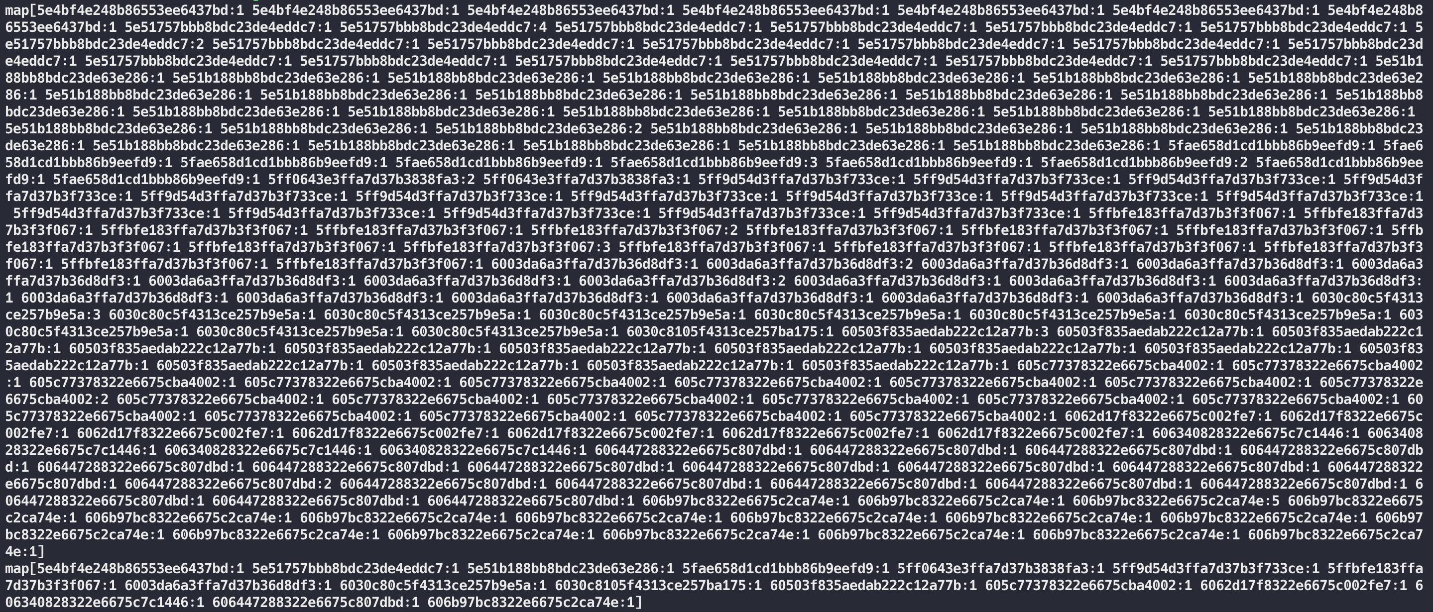 ``` access log: 34reafas0fasdfre7 = 1 access log: 34reafas0fasdfre8 = 1 access log: 34reafas0fasdfre8 = 2 access log: 34reafas0fasdfre8 = 1 access log: 34reafas0fasdfre8 = 1 access log: 34reafas0fasdfre8 = 1 access log: 34reafas0fasdfre8 = 1 map[34reafas0fasdfre8:1 34reafas0fasdfre8:6] ``` |